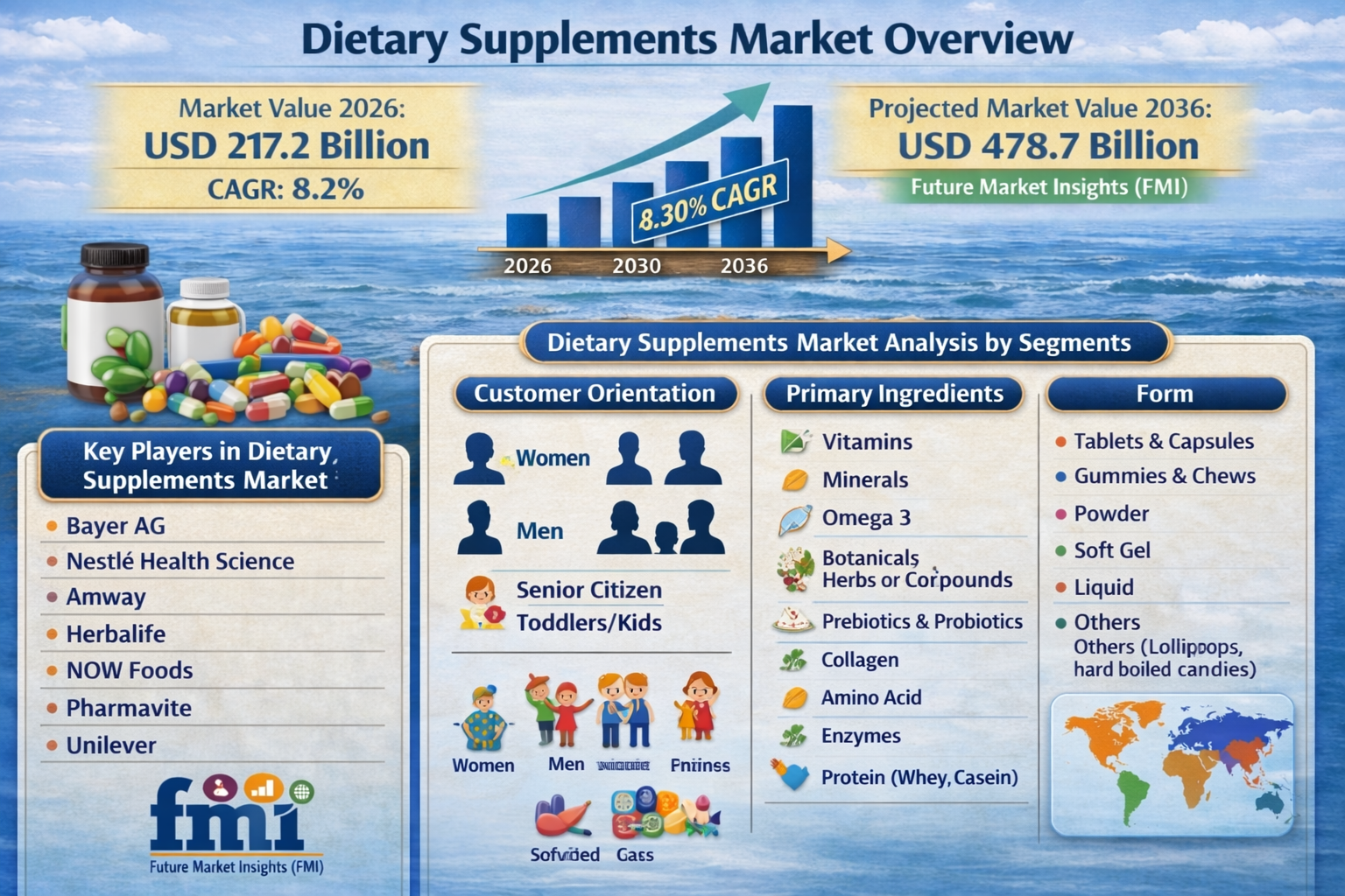 NEWARK, DELAWARE | March 27, 2026 — The global dietary supplements market is entering a high-growth phase, evolving from basic nutritional insurance to a data-backed pillar of preventative healthcare. Valued at USD 200.9 billion in 2025, the sector is projected to reach USD 217.2 billion in 2026. Propelled by a CAGR of 8.2%, the market is forecast to hit USD 478.7 billion by 2036, according to the latest study by Future Market Insights (FMI).
