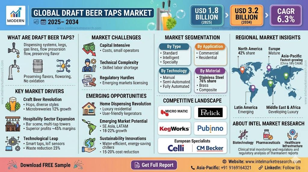 According to a new report from Intel Market Research, the global draft beer taps market was valued at USD 1.8 billion in 2025 and is projected to reach USD 3.2 billion by 2034, growing at a CAGR of 6.3% during the forecast period (2026-2034). This expansion is fueled by the global surge in craft beer popularity, premiumization trends in the beverage industry, and significant technological advancements in dispensing systems.