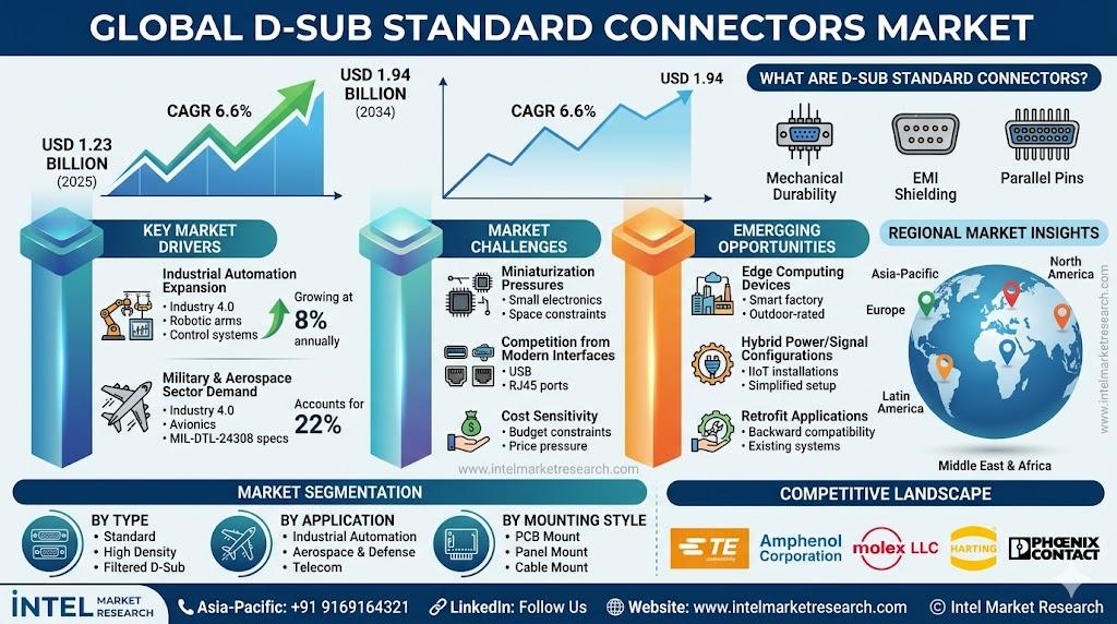 According to a new report from Intel Market Research, the global D-Sub Standard Connectors market was valued at USD 1.23 billion in 2025 and is projected to reach USD 1.94 billion by 2034, growing at a steady CAGR of 6.6% during the forecast period (2026–2034). This growth is fueled by sustained industrial demand and aerospace sector requirements, though challenged by miniaturization trends in consumer electronics.