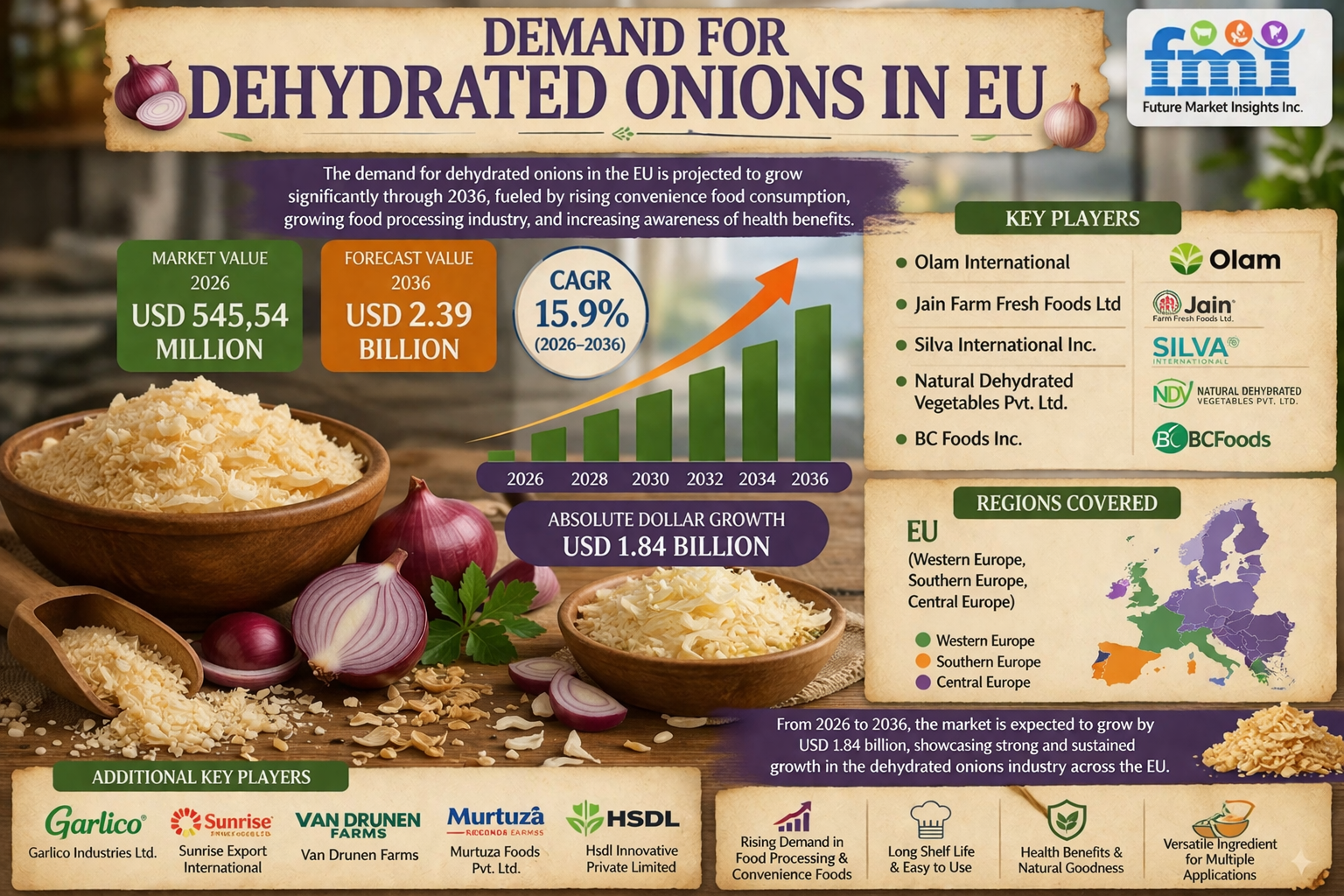 NEWARK, DELAWARE | April 6, 2026 — The demand for dehydrated onions in the European Union is witnessing rapid expansion, driven by strong growth in food processing activities and increasing reliance on shelf-stable ingredients. Valued at USD 470.70 million in 2025, the market is projected to reach USD 545.54 million in 2026 and is forecast to surge to USD 2.39 billion by 2036, registering a CAGR of 15.9%, according to the latest analysis by Future Market Insights (FMI).