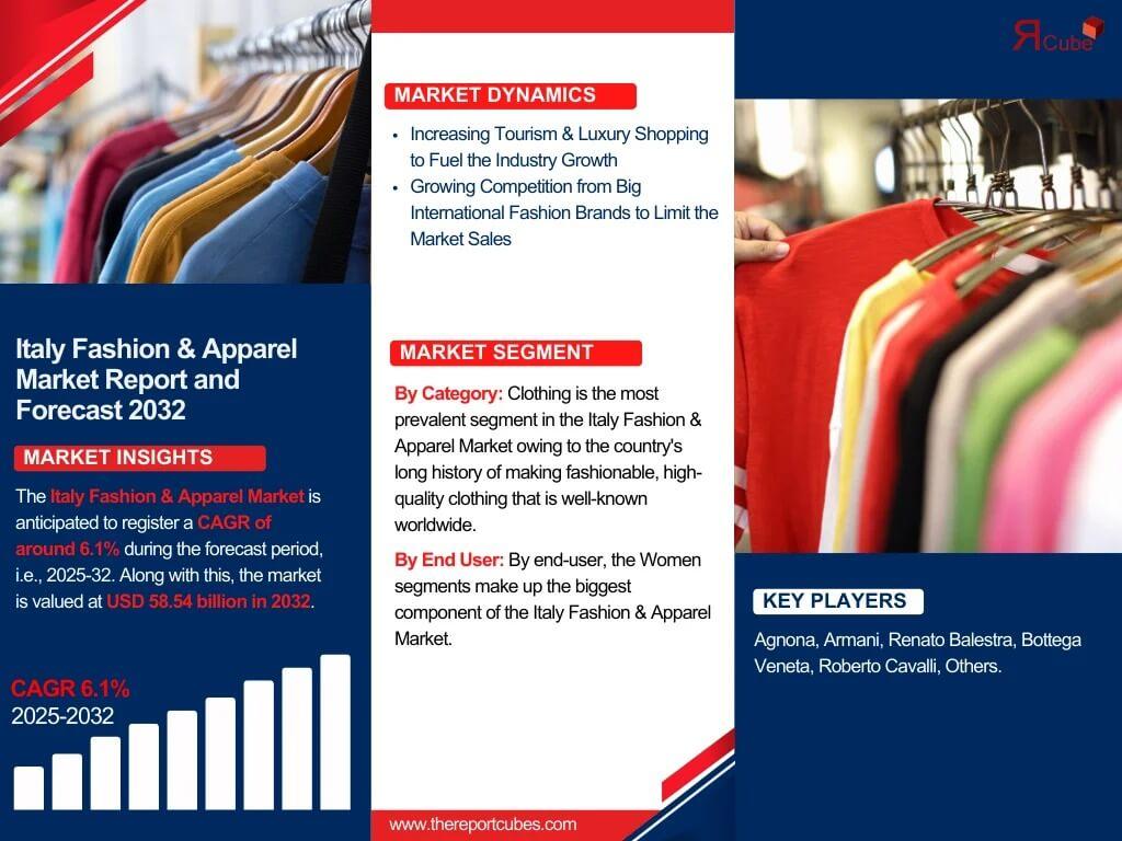 The Report Cube, a leading market research company, has officially released its latest study titled "Italy Fashion & Apparel Market Report and Forecast 2026-2034" The report projects the size of Italy Fashion & Apparel market to be valued at USD 58.54 Billion by the end of the forecast period, expanding at a compound annual growth rate (CAGR) of 6.1%.