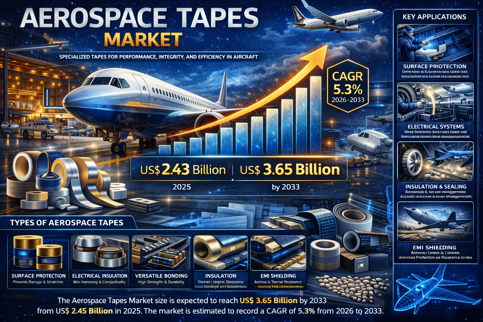The financial trajectory of this sector remains robust. According to recent industry analysis, the Aerospace Tapes Market size is expected to reach US$ 3.65 Billion by 2033 from US$ 2.43 Billion in 2025. The market is estimated to record a CAGR of 5.3% from 2026 to 2033.