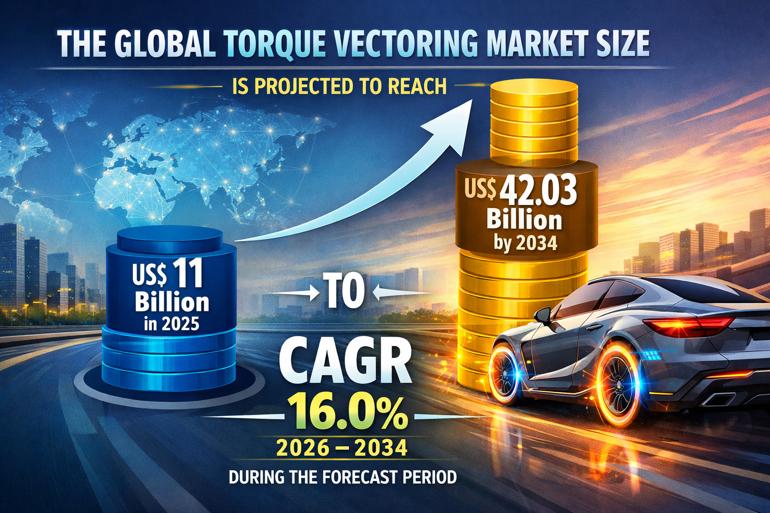 The global torque vectoring market size is projected to reach US$ 42.03 billion by 2034 from US$ 11 billion in 2025. The market is anticipated to register a CAGR of 16.0% during the forecast period 2026–2034. This robust growth is primarily driven by the increasing production of high performance vehicles and the rapid transition toward electric propulsion systems, which offer greater flexibility for torque management.
