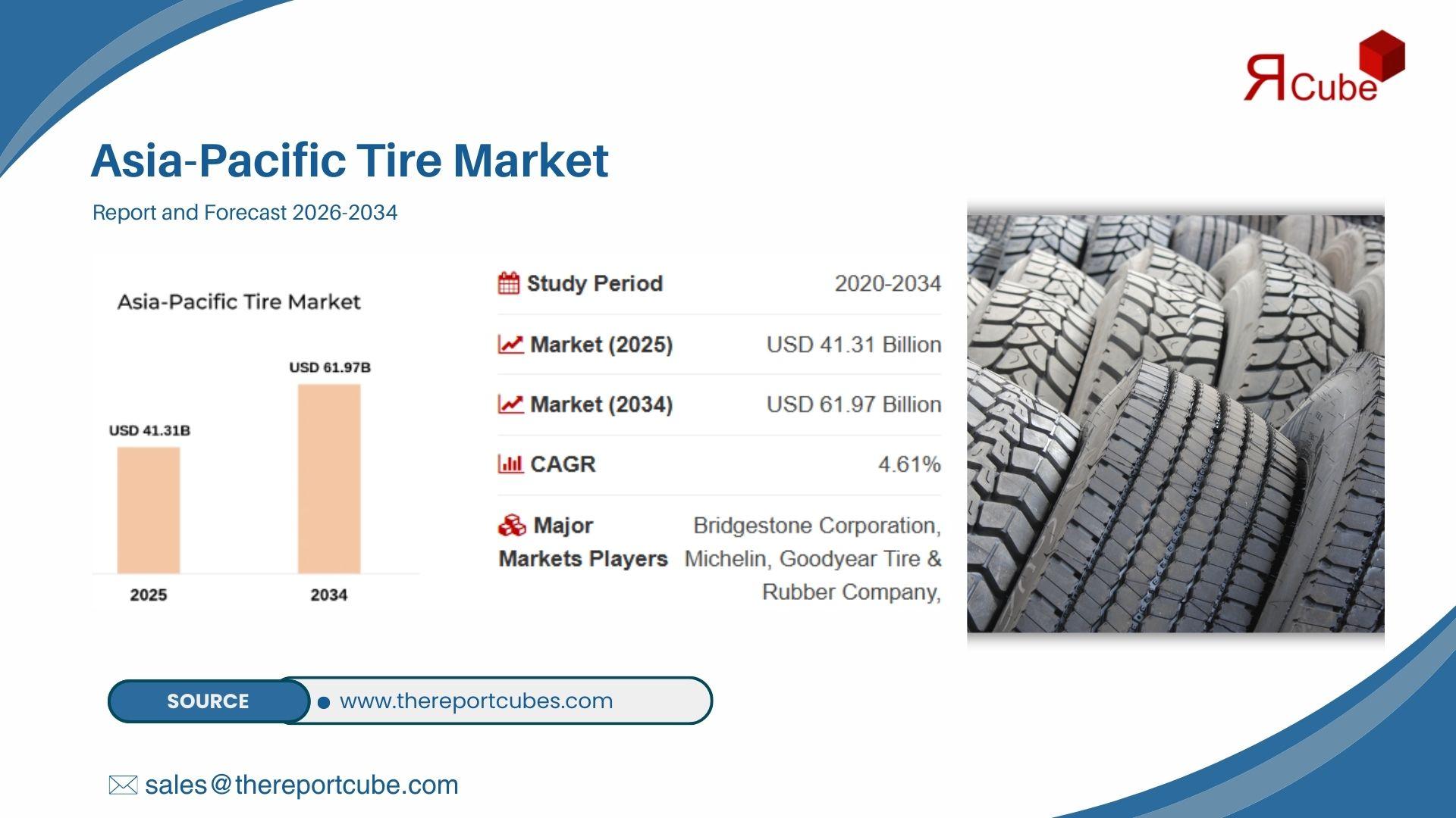 According to the Asia-Pacific Tire Market Research Report (2026-2034) by Report Cube, the market was valued at approximately USD 41.31 Billion in 2025. Based on current industry structure and observed demand patterns, the market is projected to reach USD 61.97 Billion by 2034, expanding at a 4.61% CAGR during the forecast timeline.