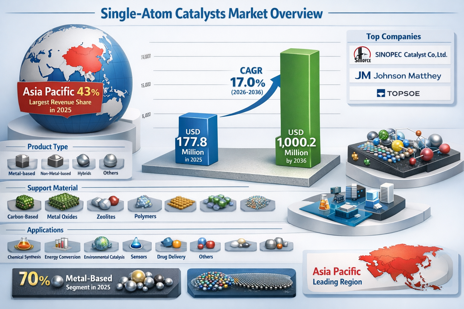 The global single-atom catalysts market was valued at USD 177.8 million in 2025 and is projected to reach USD 1,000.2 million by 2036, expanding at a strong CAGR of 17.0% from 2026 to 2036. Market growth is primarily driven by the rapid adoption of green hydrogen and fuel-cell technologies, along with rising demand for industrial emissions control and electrification-driven chemical manufacturing, where single-atom catalysts offer superior efficiency, selectivity, and reduced material usage.