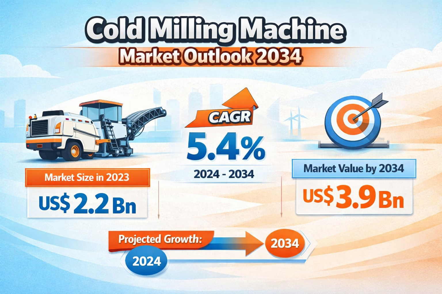 In 2023, the global cold milling machine industry was valued at US$ 2.2 billion. Analysts estimate that the market will grow at a CAGR of 5.4% over the forecast period from 2024 to 2034, reaching approximately US$ 3.9 billion by 2034. This steady growth reflects the rising demand for efficient road construction and rehabilitation equipment across developed and emerging economies.