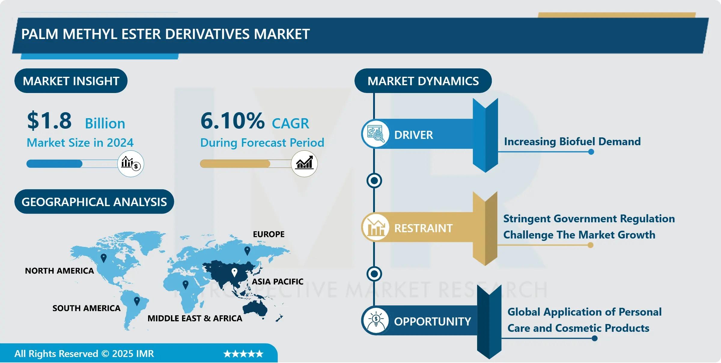 “According to a new report published by Introspective Market Research Private Limited, Palm Methyl Ester Derivatives Market by Product Type, Application, and End-Use Industry, the global Palm Methyl Ester Derivatives Market size was valued at USD 1.8 Billion in 2024 and is projected to reach USD 3.45 Billion by 2035, growing at a CAGR of 6.10% from 2025–2035.”