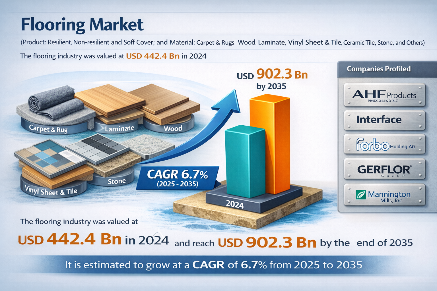 The global flooring market was valued at USD 442.4 billion in 2024 and is projected to reach USD 902.3 billion by the end of 2035, growing at a CAGR of 6.7% from 2025 to 2035. Market growth is driven by rapid urbanization, rising construction activities, and increasing demand for aesthetic and durable flooring solutions across residential, commercial, and industrial sectors. Technological innovations in materials such as luxury vinyl tiles, laminates, and eco-friendly flooring options are further supporting the market’s strong expansion over the forecast period.