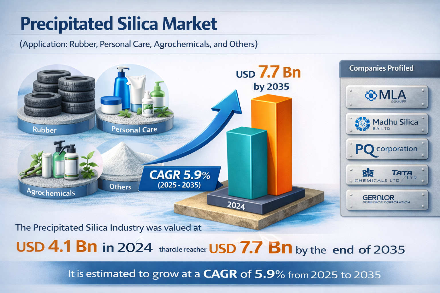 The global precipitated silica market was valued at USD 4.1 billion in 2024 and is projected to reach USD 7.7 billion by the end of 2035, growing at a CAGR of 5.9% from 2025 to 2035. Market growth is driven by rising demand from the tire and rubber industry for fuel-efficient and high-performance tires, along with expanding applications in food, personal care, and oral care products. Increasing focus on green tires and advancements in specialty silica grades are further supporting steady market expansion over the forecast period.