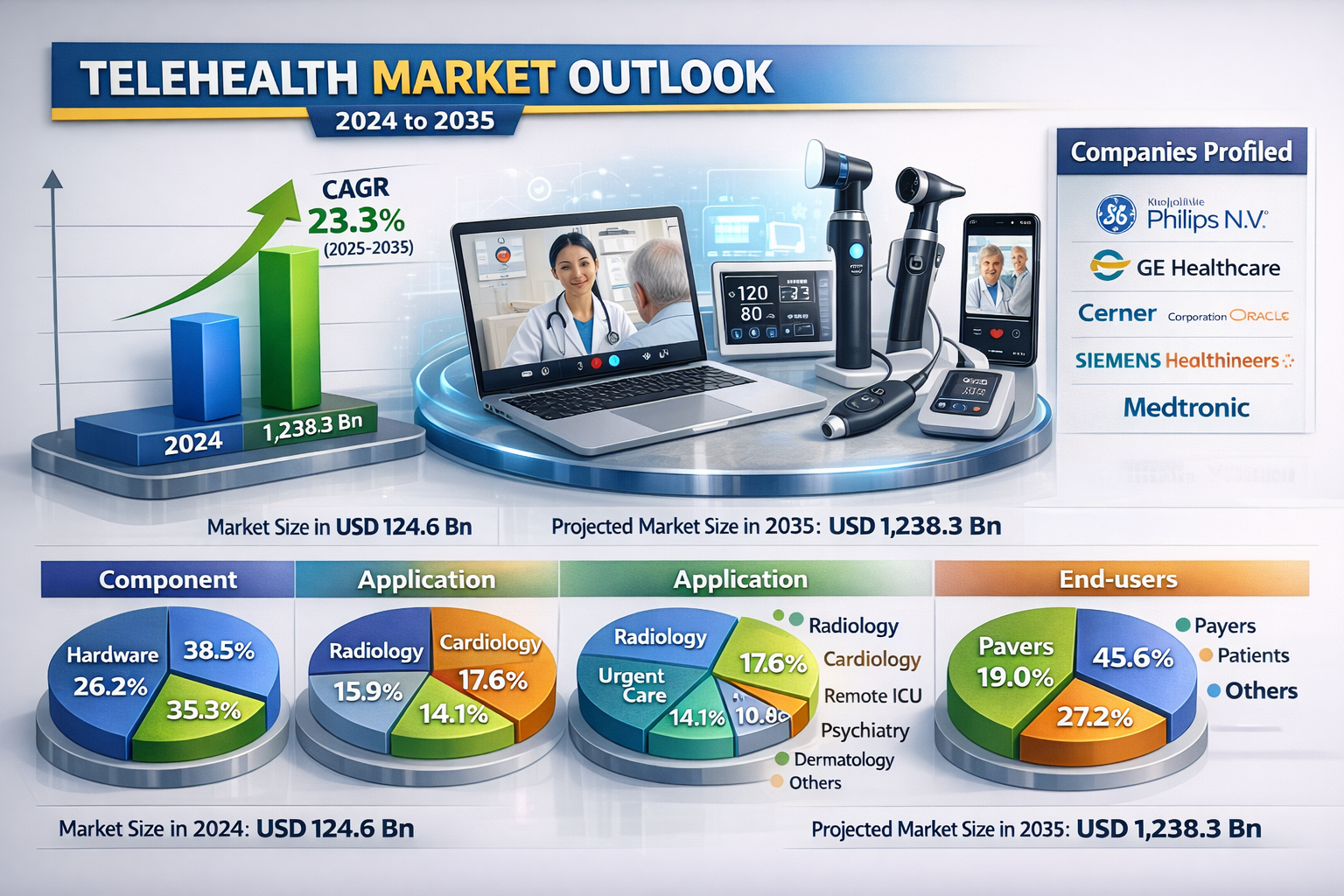 The global telehealth market was valued at USD 124.6 Bn in 2024 and is projected to reach USD 1,238.3 Bn by the end of 2035, expanding at a remarkable CAGR of 23.3% from 2025 to 2035. Growth is driven by increasing demand for remote healthcare services, rapid digital health adoption, and rising penetration of smartphones and high-speed internet. Additionally, supportive government initiatives, growing chronic disease burden, and continuous advancements in virtual care technologies are expected to significantly accelerate market expansion over the forecast period.