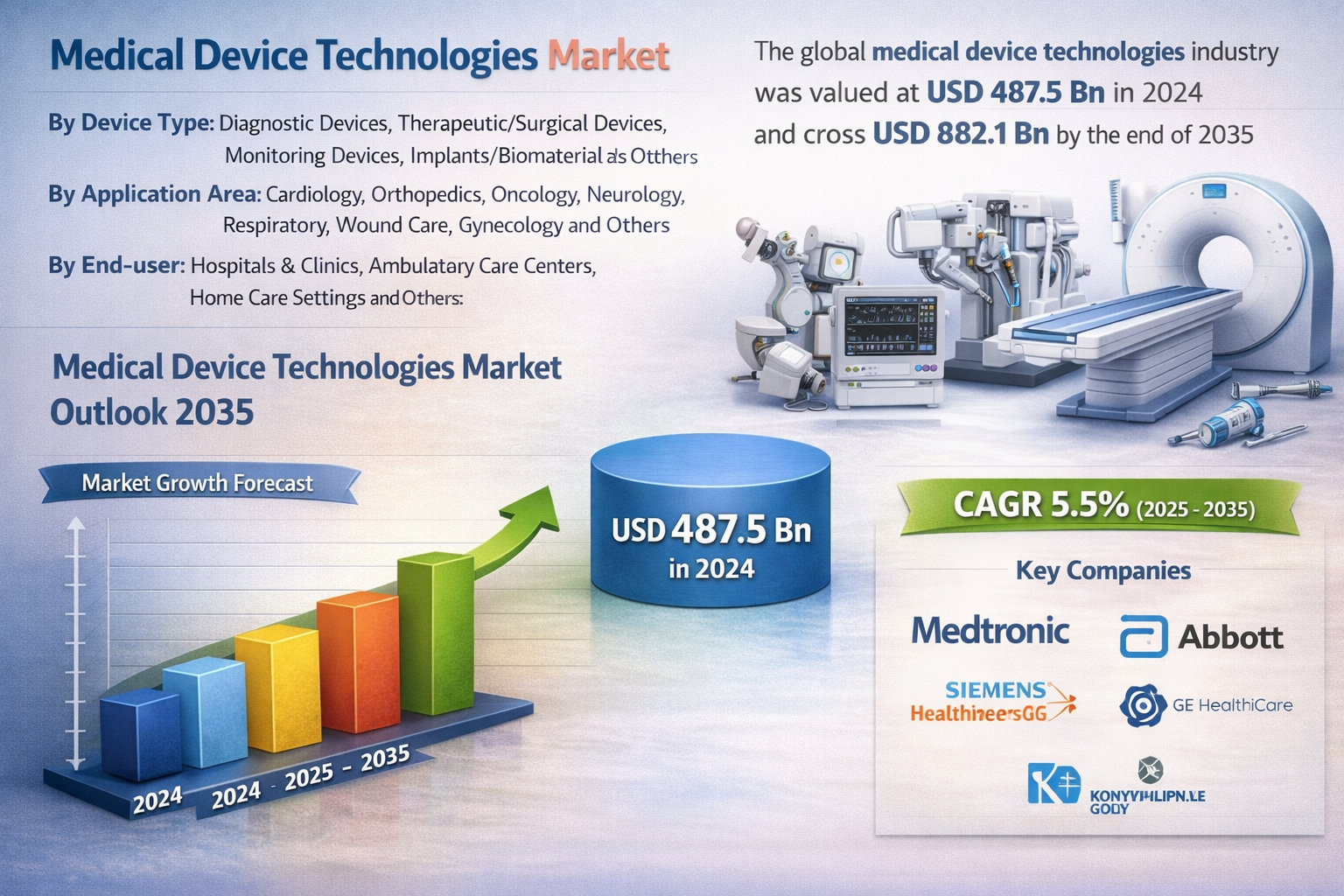 The global medical device technologies industry was valued at USD 487.5 billion in 2024 and is projected to surpass USD 882.1 billion by the end of 2035, growing at a CAGR of 5.5% from 2025 to 2035. Market growth is driven by rising demand for advanced diagnostic and therapeutic devices, increasing prevalence of chronic diseases, and continuous technological innovations in healthcare equipment.
