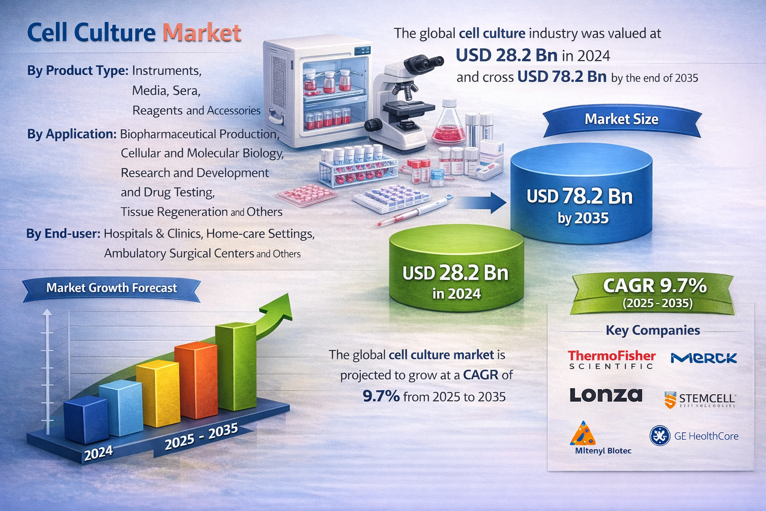 The global cell culture industry was valued at USD 28.2 billion in 2024 and is projected to surpass USD 78.2 billion by the end of 2035, growing at a CAGR of 9.7% from 2025 to 2035. Market growth is driven by increasing demand for biologics and vaccines, rising adoption of cell-based research in drug discovery, and expanding investments in biotechnology and pharmaceutical R&D.