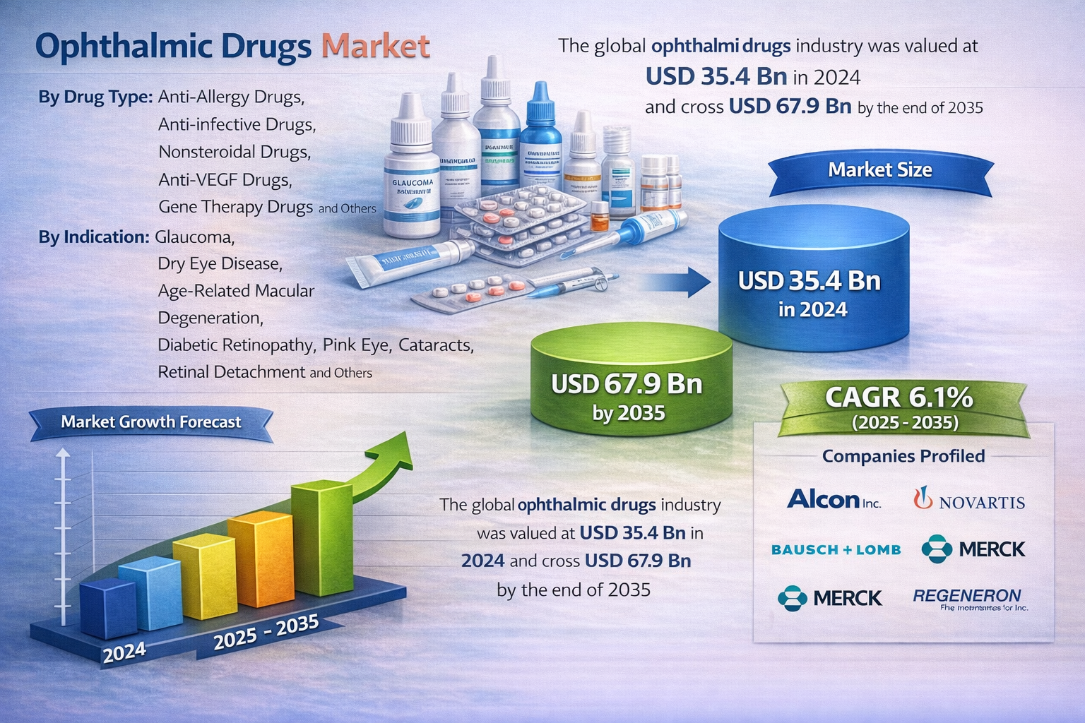 The global ophthalmic drugs industry was valued at USD 35.4 billion in 2024 and is projected to surpass USD 67.9 billion by the end of 2035, growing at a CAGR of 6.1% from 2025 to 2035. Market growth is driven by the rising prevalence of eye disorders, increasing aging population, and growing demand for advanced therapies for glaucoma, dry eye, and retinal diseases.