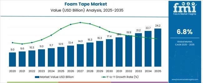 The Foam Tape Market is valued at USD 12.5 billion in 2025 and is projected to reach USD 24.2 billion by 2035, expanding at a CAGR of 6.8% over the forecast period. Growth is supported by rising demand for lightweight, high-performance bonding and sealing solutions across automotive, construction, electronics, and industrial manufacturing sectors. As industries shift toward cleaner aesthetics, vibration dampening, and faster assembly processes, foam tapes are increasingly replacing mechanical fasteners. Their ability to provide sealing, cushioning, insulation, and strong adhesion positions the Foam Tape Market as a critical enabler of modern manufacturing efficiency.
